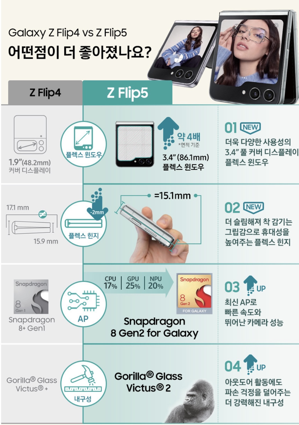 갤럭시 Z 플립5가 8월 12일 공식 출시를 앞두고 8월 1일부터 8월 7일까지 사전 판매를 진행하고 있습니다. 지난 7월 26일 언팩 행사에서 공개된 갤럭시 Z 폴드5는 디자인부터 전 모델인 Z 플립4와 비교할 때 많이 바뀐 모습입니다. 구체적으로 어떤 부분이 달라지고 업그레이드 되었는지 갤럭시 Z 플립5의 스펙에 대해 하나씩 살펴보도록 하겠습니다.