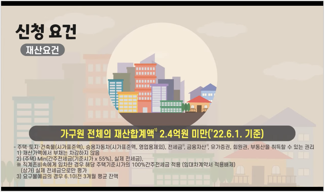 재산요건은 20022년 6월 1일 기준 주택, 토지, 건축물, 자동차, 전세금, 금융자산 등 가구원 전체의 재산합계액이 2.4억원 미만이어야 합니다.