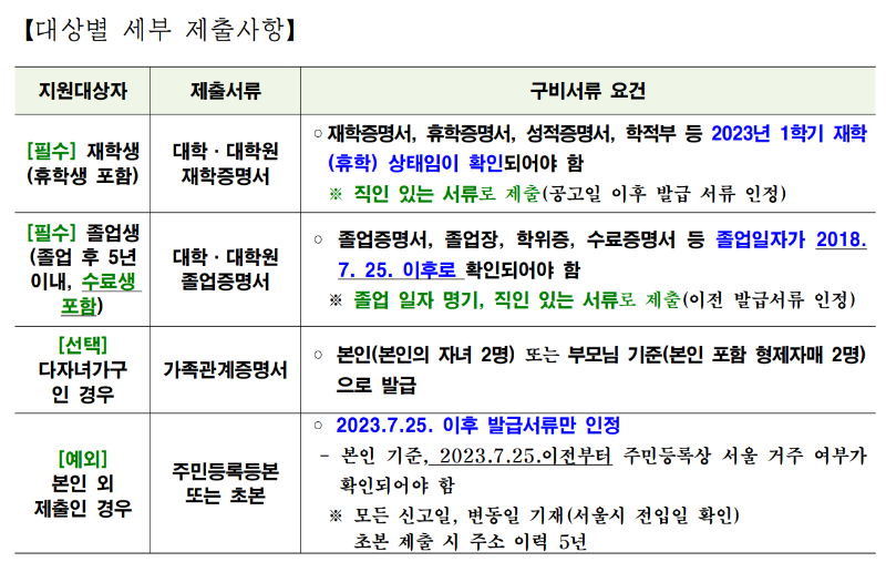 - 공고일 기준 주민등록상 주소가 서울이며, 2023 상반기 (1~6월) 국내 대학 • 대학원 재학생 및 휴학생