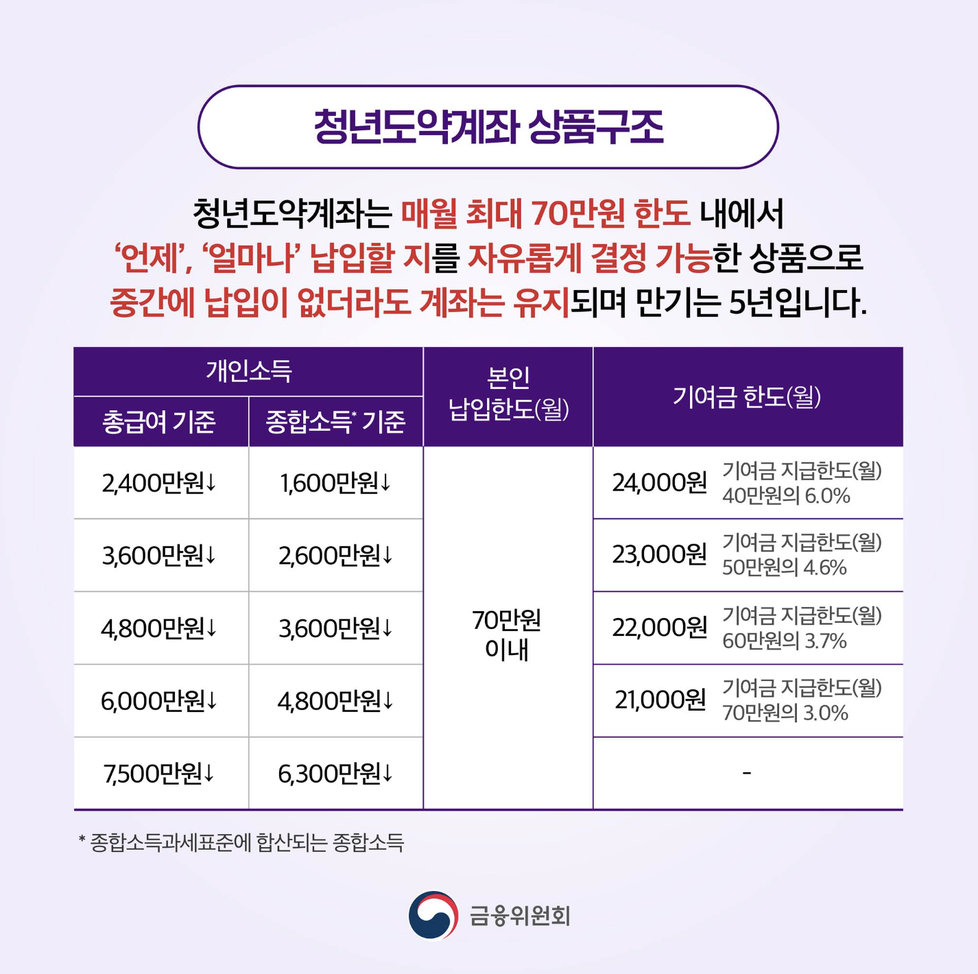 -개인소득: 직전 과세기간 총급여 7,500만원 이하 (단, 6,000만원 초과 7,500만원 이하인 경우 정부기여금 지급없이 비과세만 적용)